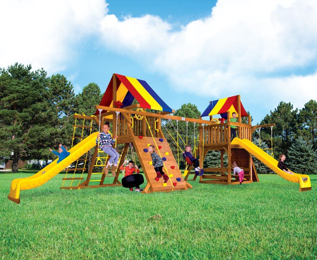Rainbow Play Systems also offers customized swing sets, to fit every family’s needs. Visit a showroom near you to get started on creating your child’s dream double slide swing set!
