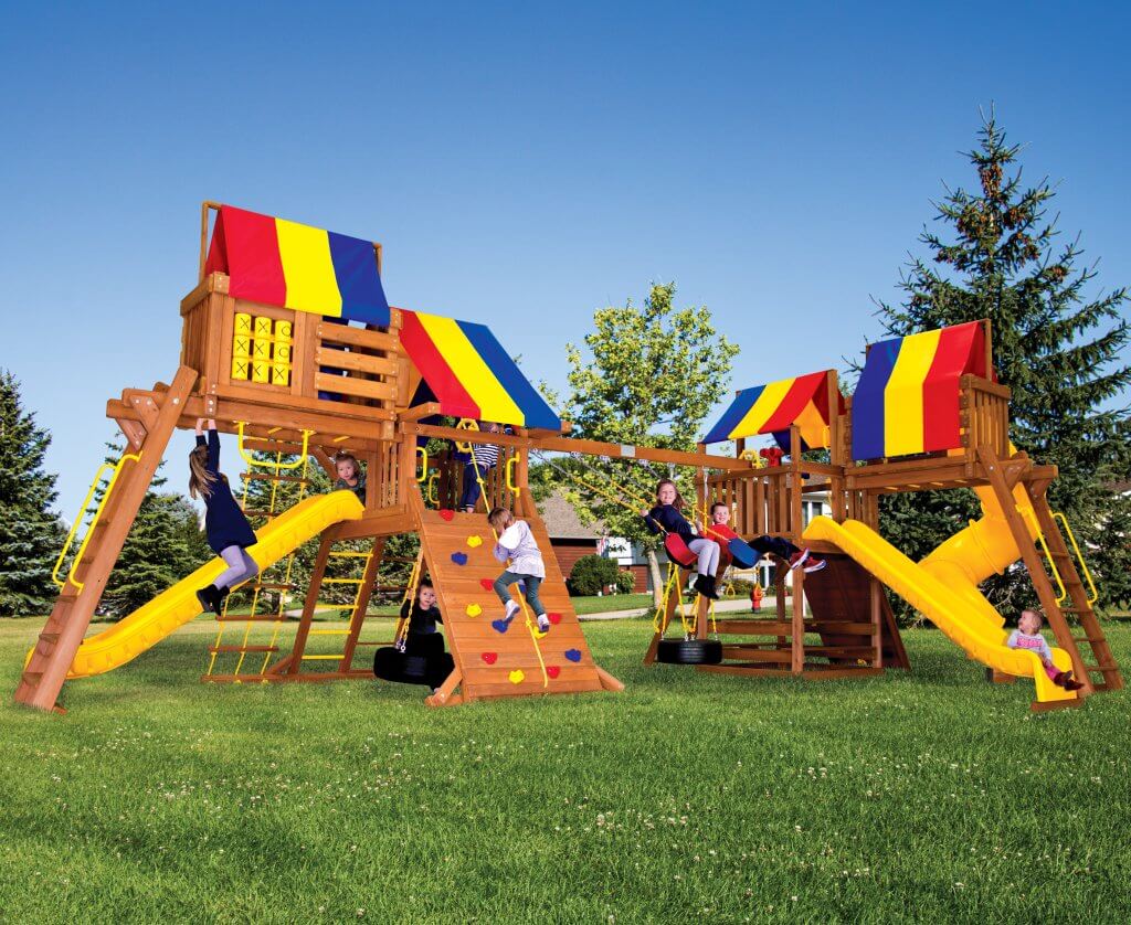 Our Double Whammy playset offers not one, but two slides, a swing set, sun awnings, and more customizable options! Whether you have a big family, or your yard is the gathering spot for the neighborhood kids, this double slide swing set will provide not only hours, but years of fun.