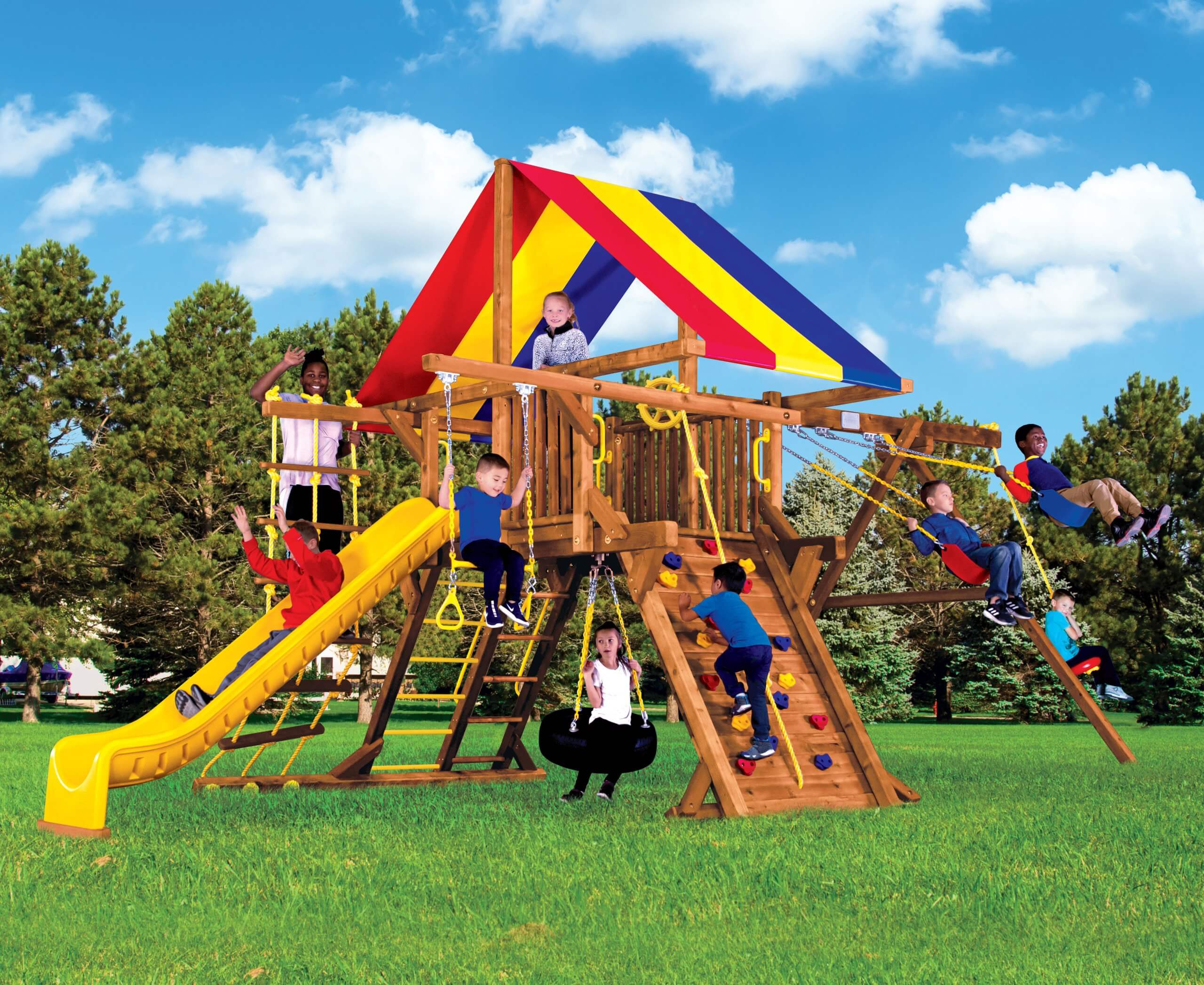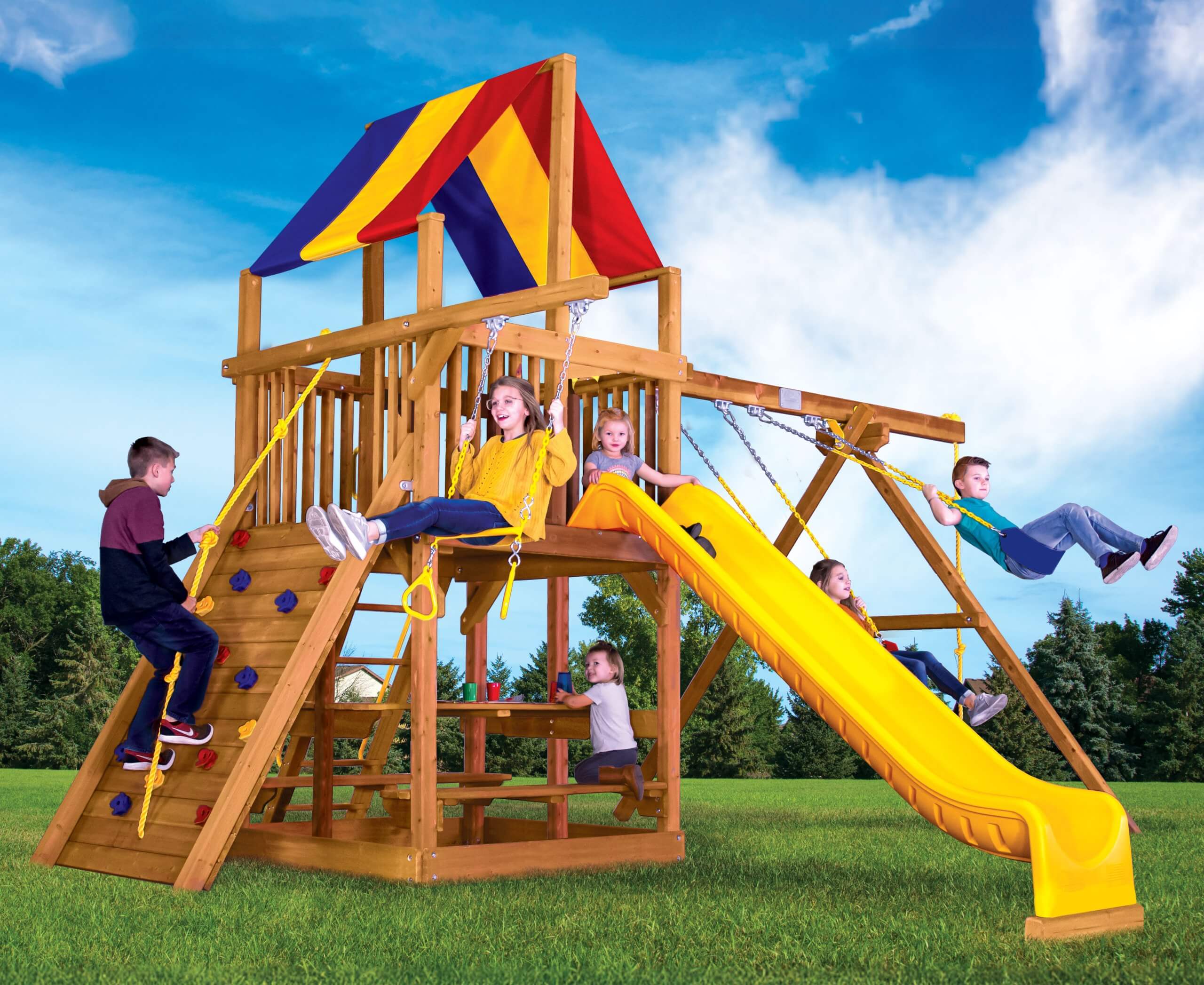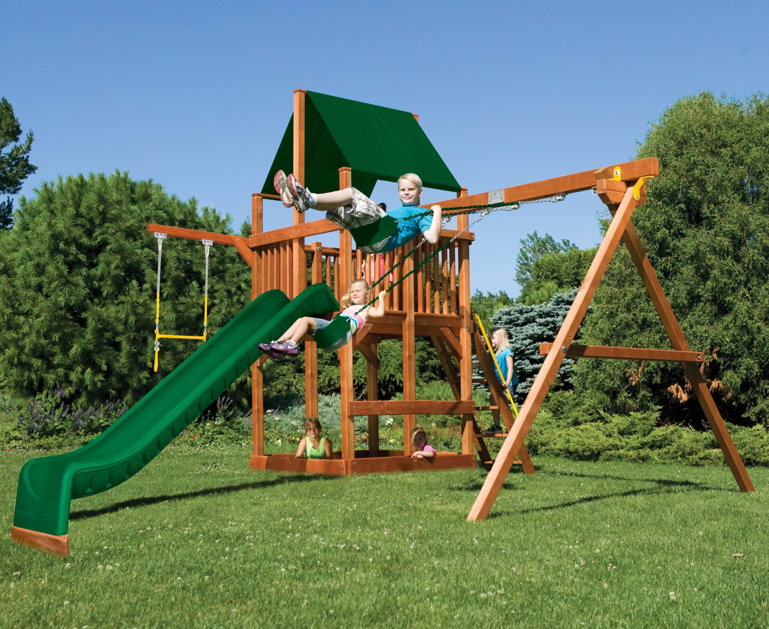 Our high-quality outdoor playsets provide years of fun! We offer a variety of outdoor swing sets for kids, accommodating any age range or yard type. Each of our specialty swing sets comes with customizable features, allowing you to create the perfect configuration for your family. We guarantee that our kids’ swing sets are not only fun, but also safe and durable. Our slides are designed with high walls to promote safety, and all of our play swing sets are made of weather-resistant treated cedar, which has great longevity and helps to prevent splinters.